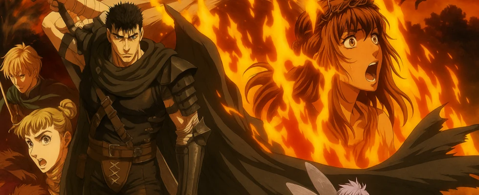 «Берсерк» рассказывает историю Гатса — наёмника с трагическим прошлым, и его борьбы в мире, полном жестокости, демонов и предательства. Сюжет охватывает период «Золотого века», восхождение Банди Ястреба во главе с Гриффитом, а затем падение и ужасное «Затмение», изменившее судьбы героев. Это мрачное тёмное фэнтези стало культовым произведением, известным своей глубиной, трагичностью и жёсткими боевыми сценами. Аниме-адаптации включают классический сериал 1997 года, CGI-версии 2016–2017 годов и трилогию фильмов «Golden Age Arc».