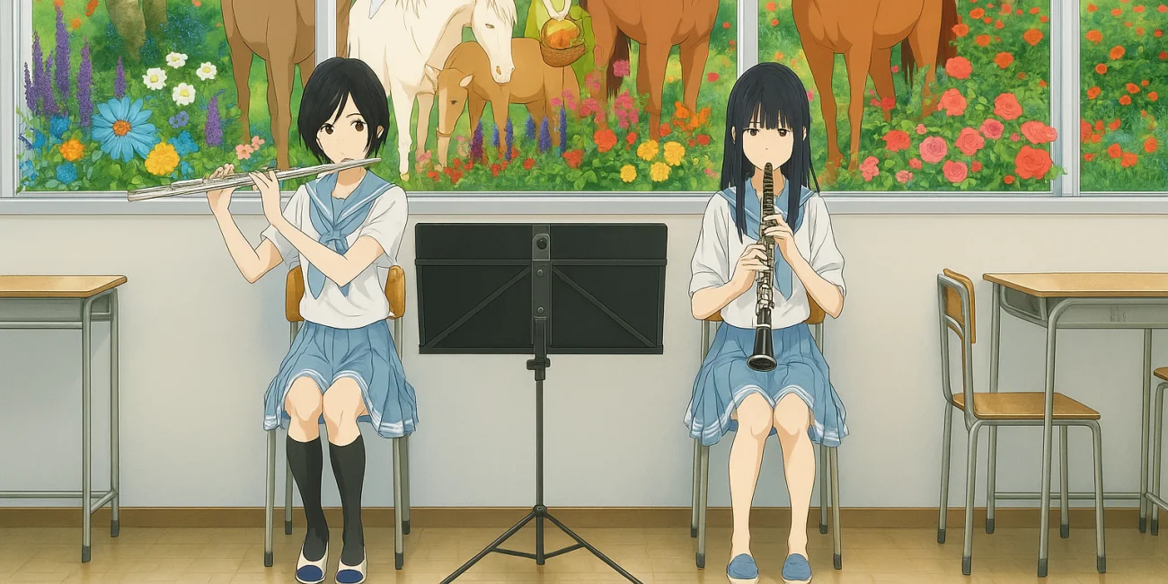 Две лучшие подруги Мидзорэ и Нодзоми учатся в выпускном классе и состоят в клубе школьного духового оркестра. Тихая и застенчивая Мидзорэ играет на гобое, а жизнерадостная Нодзоми — на флейте. Однажды клуб начинает репетировать музыку, вдохновлённую сказкой «Лиз и голубая птица». Флейта и гобой изображают Лиз и Девушку, которые в конце обязательно расстаются. Погрузившись в эту удивительную историю, Мидзорэ и Нодзоми начинают осознавать, что сами не смогут быть вместе всегда.